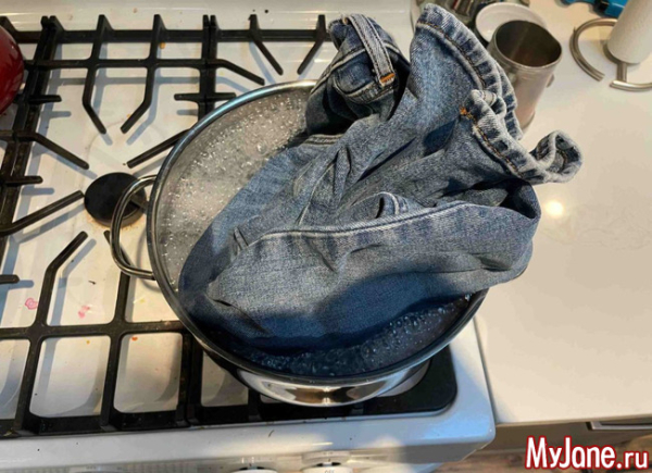 Уменьшите джинсы, поместив их в горячую воду. Наполните большую кастрюлю или бак водой и нагрейте примерно до 70 градусов. Но не кипятите. Имейте в виду, что слишком горячая вода может повредить ткань, особенно с примесью синтетики. Теперь выверните джинсы наизнанку и поместите их в кастрюлю. Убедитесь, что джинсы полностью погружены в воду. Оставьте их примерно на 20–30 минут. Время от времени помешивайте воду. После этого выжмите и полностью высушите джинсы любым способом, в том числе и в сушилке.