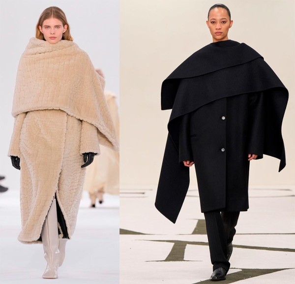Это один из самых примечательных трендов нового сезона. В нем объединяется практичность и стиль. Палантин может быть включен в конструкцию пальто, что создает эффект многослойности, а может стать самостоятельной деталью. В любом случае палантин добавляет тепло и делает образ стильным, он может быть из того же материала что и пальто, создавая монохром. Пальто в сочетании с палантином или длинным шарфом дизайнеры предлагают в стиле оверсайз с акцентированными плечами.