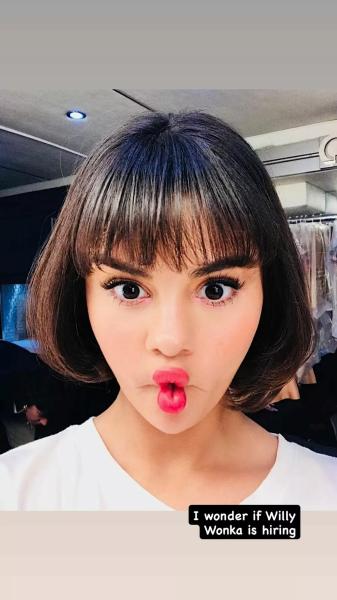 В воскресенье, 12 октября, Селена Гомес продемонстрировала новую прическу с прямой челкой. На селфи Гомес нанесла легкий макияж с красной помадой и театрально втянула щеки.